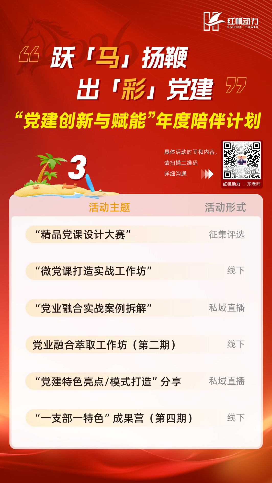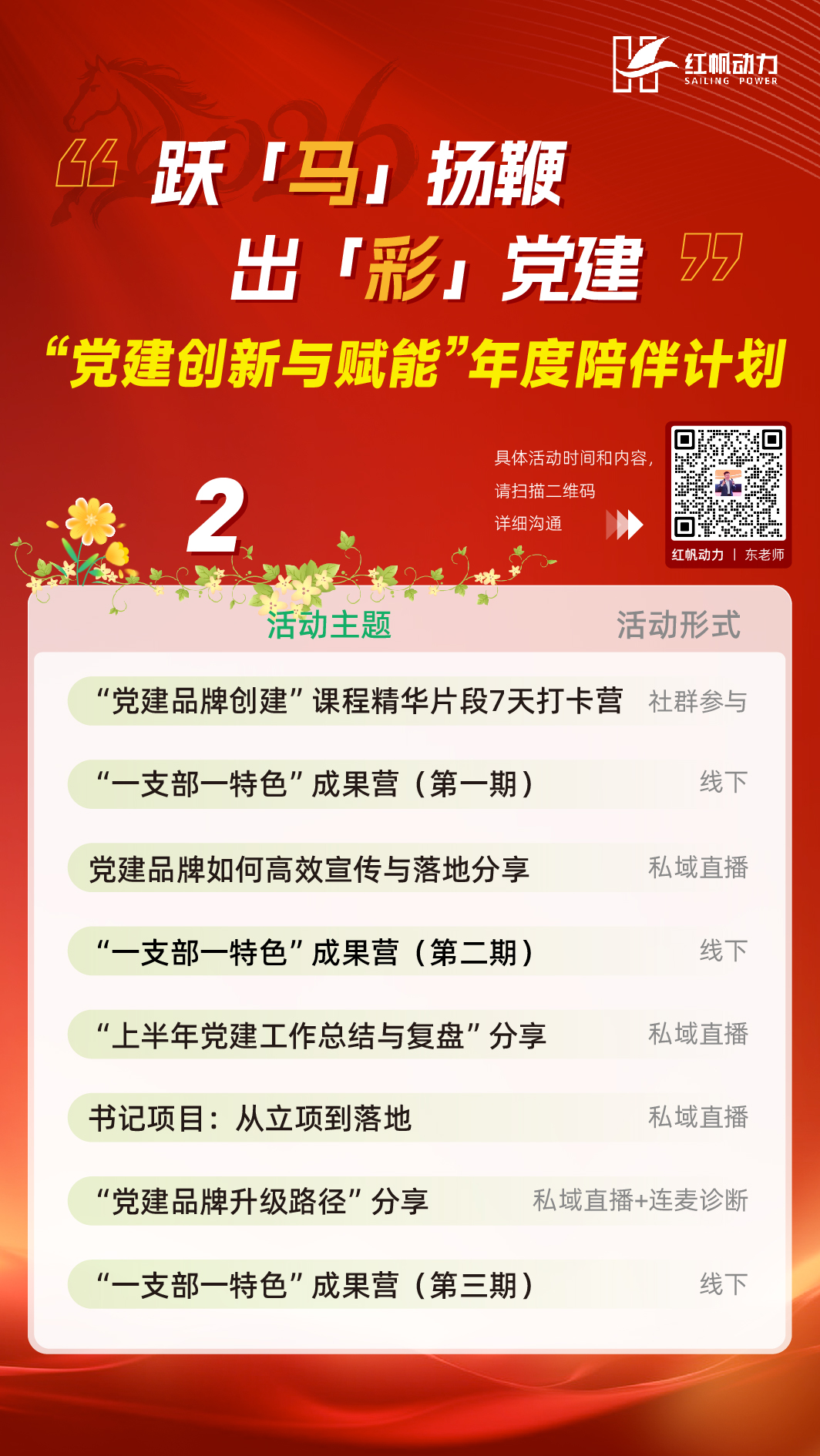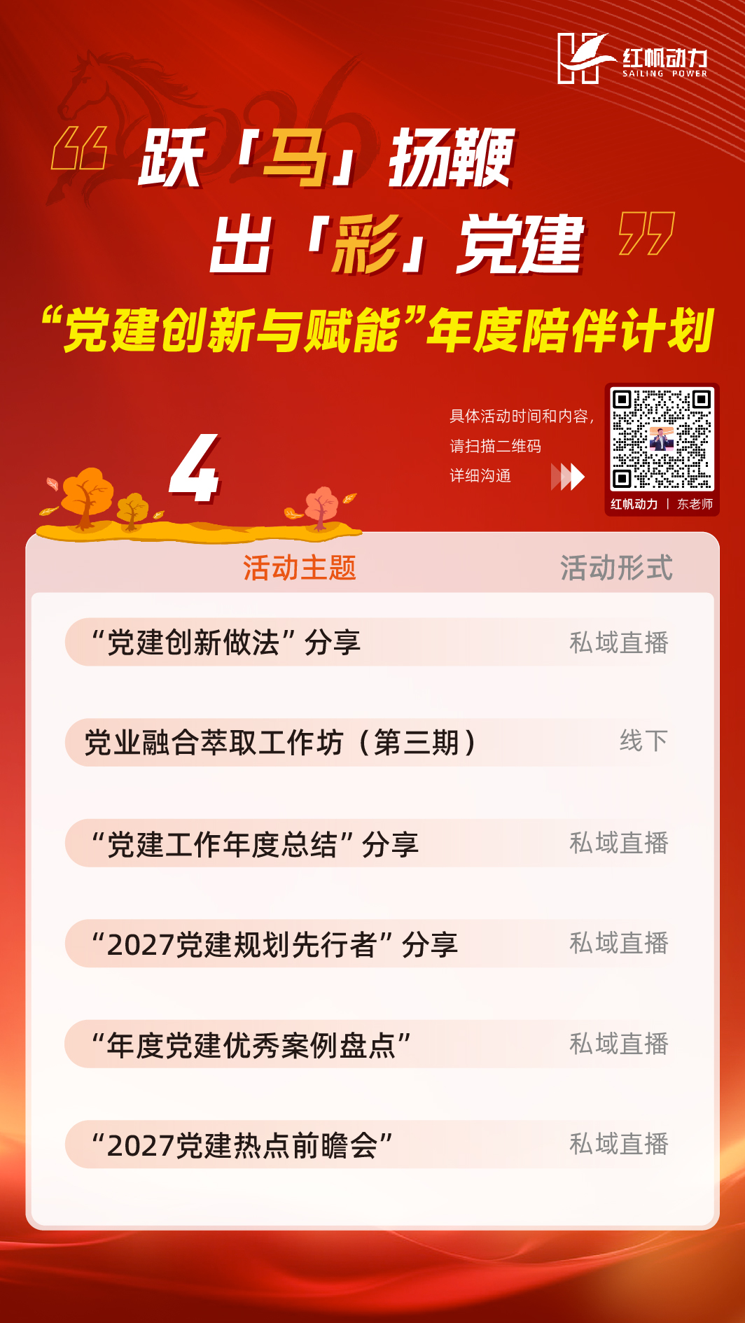 👉👉👉哪一场活动最吸引你?快扫描二维码喊出你最想蹲的活动!跃马扬鞭启新程,出彩党建正当时!这份「党建创新与赋能」年度陪伴计划,从趋势解读到实战工坊,从品牌打造到党业融合,为你准备了一整年的干货与陪伴。
