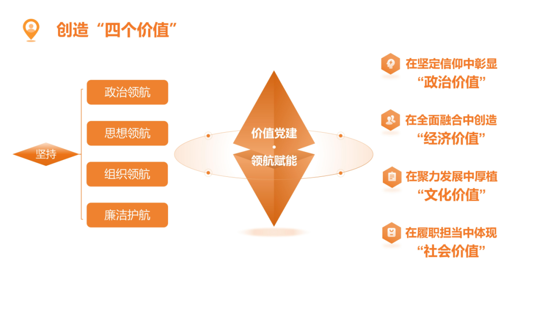 “4"是坚持政治领航、思想领航、组织领航、廉洁护航,创造”四个价值“