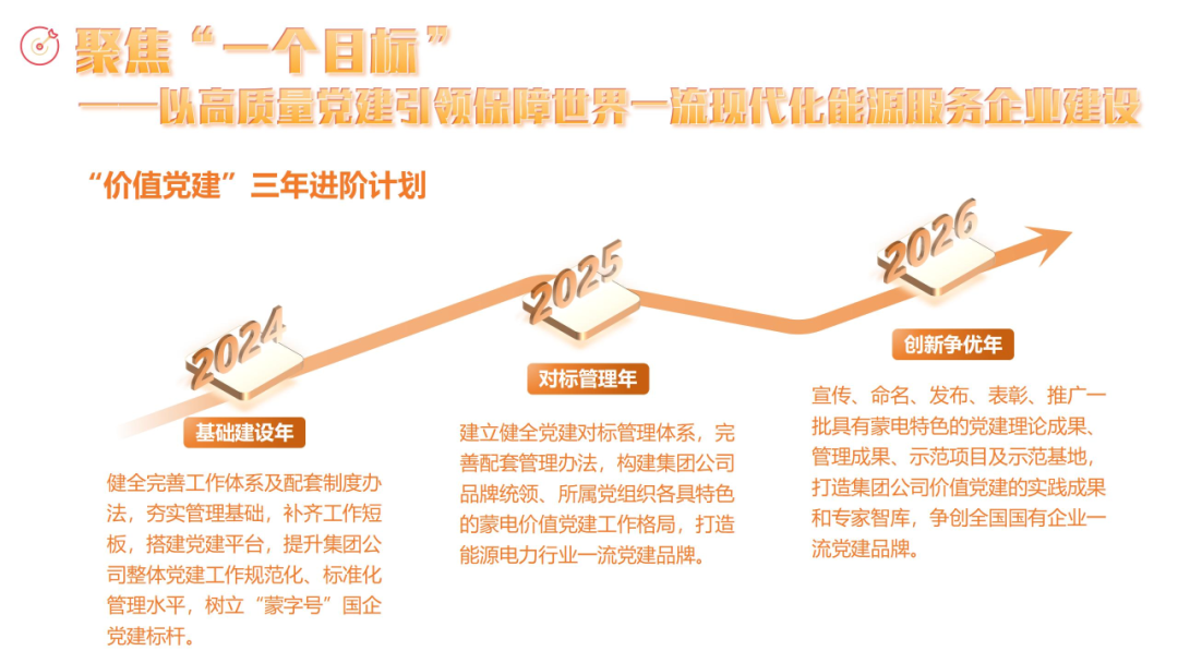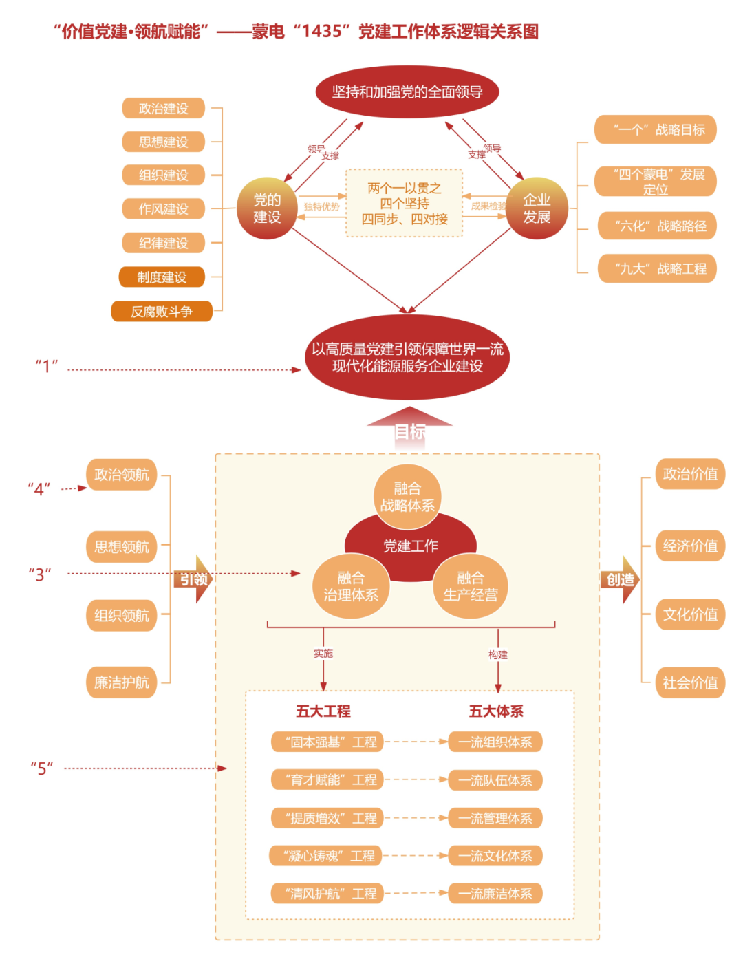 内蒙古电力集团立足党建工作与企业治理的无缝对接、与生产经营的深度融合,优化党建资源和企业资源的配置效率,形成企业价值链、凝成党建生产力,提出实施与企业战略目标相衔接的“价值党建·领航赋能”——蒙电“1435”党建工作体系,全面、系统、整体加以落实党的领导、加强党的建设。